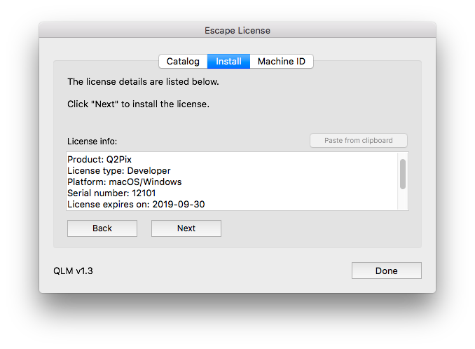 The license key has been installed and you are seeing the Catalog tab of the dialog.