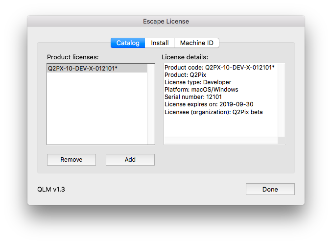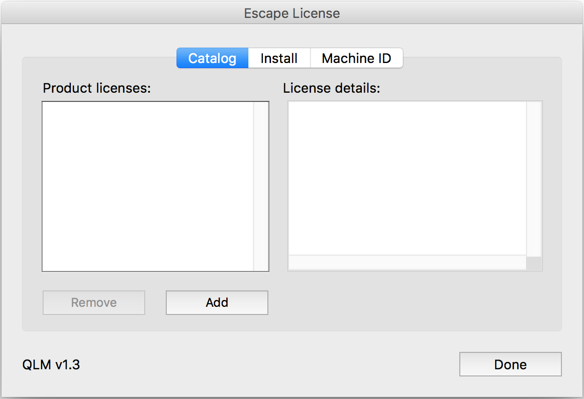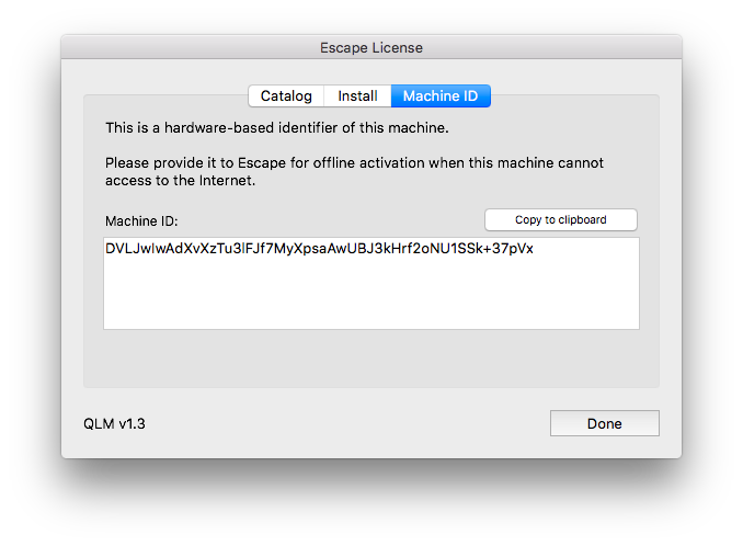 The ELM dialog lets review and modify all installed license keys of all Escape plug-ins, as well as obtain the computer's Machine ID (needed when ordering pre-activated license keys).